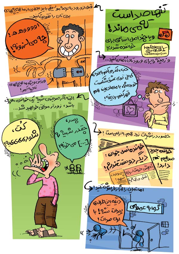 This is a comic strip on pop music and singers and teaches you how to become a successful singer in 5 steps! At first you have to practice dancing and then leave your home and family (specially your mom!) after you'd better sing like a famous artist. Interview with magazines and at last if you have time you would do some practices for singing!