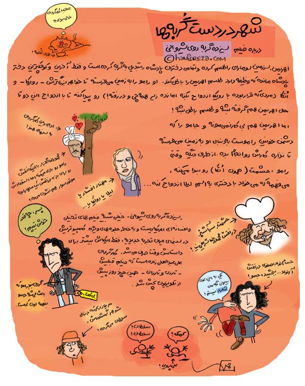 13 cats... won the special prize of jury in the 22nd Fajr Film Festival last year because of the computer generated special effects. This comic-review was published in Iran Jom'e October 2004.